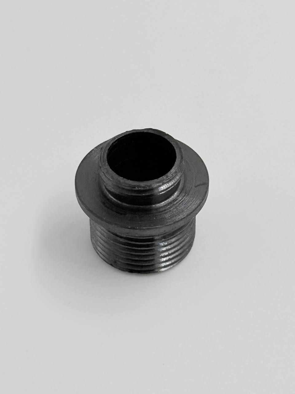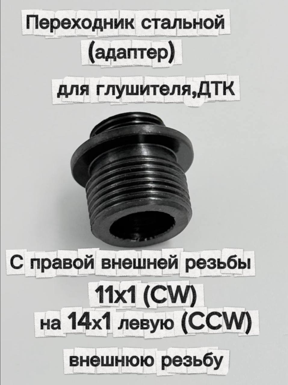 Переходник с правой внешней резьбы 11х1 (CW) на 14х1 левую (CCW) внешнюю резьбу. Правая 11 резьба встречается в некоторых моделях пистолетов и ПП. Переходник позволяет устанавливать на них модели глушителей, трассерных насадок, а так же ДТК с 14 отрицательной/левой резьбой. Сделано из высокопрочной стали в г Санкт-Петербург. Производитель ПЕТР. Длина 15 мм. Ширина 11 мм и 14 мм в зависимости от стороны резьбы.