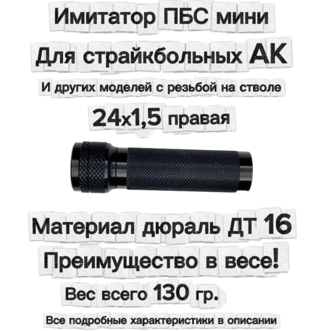Имитатор ПБС мини дюралевый для страйкбольных приводов АК и других моделей с резьбой 24 шаг 1.5 правая