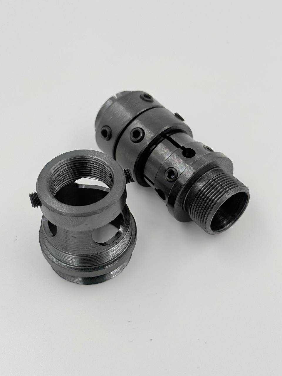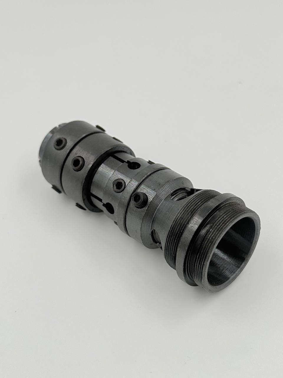 Резьба стыковки с модератором 29 на 0.75. Уникальное крепление, которое надежно держит саундмодератор закрепленный на стволе, при стрельбе из мощных пневматических винтовок. Есть специальные отверстия для реверса воздушного потока.