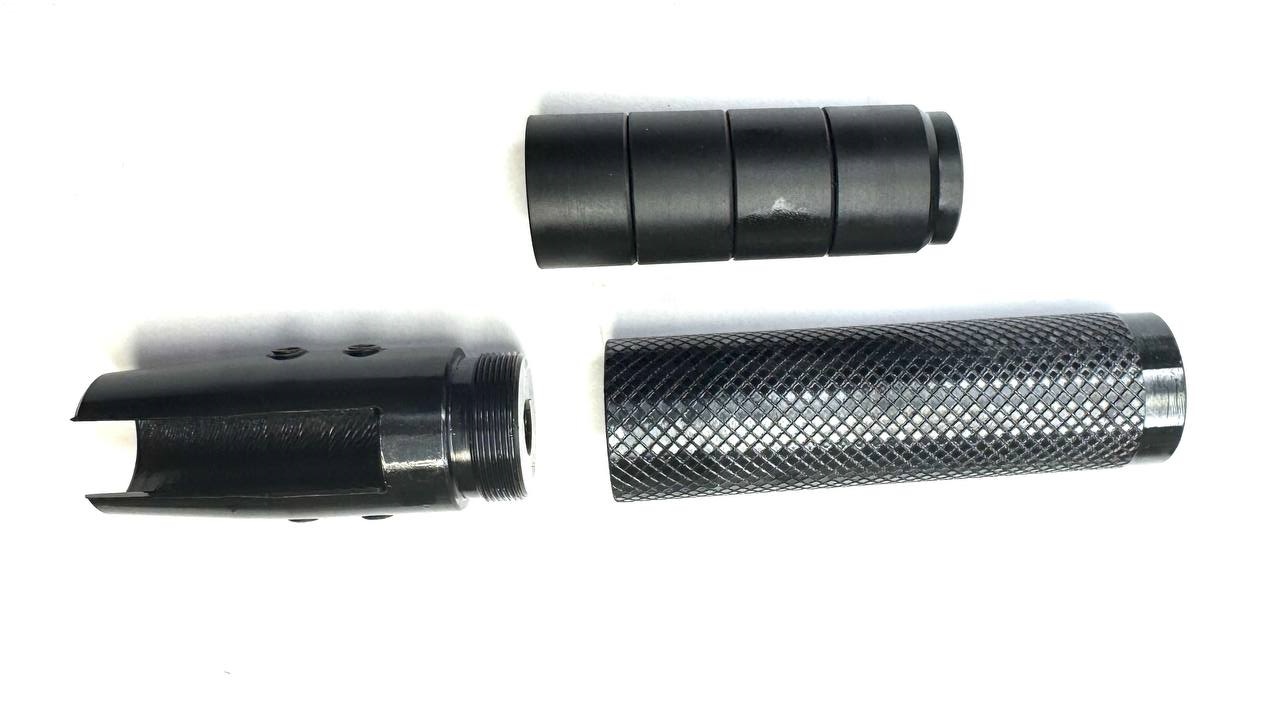Новинка от ПЕТРА! Стильный мини модератор сделан из высокопрочной стали с внутренними шумо вибропоглощающими камерами внутри. Приглушает звук, убирает лишнии вибрации и играет роль удобного рычага для перезарядки пистолета. В комплекте 4 шт шумо вибропоглащающих камеры. Вес 170 гр. Длина с креплением 130 мм.