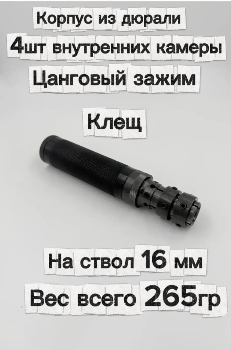 Новинка от ПЕТРА! Стильный мини модератор сделан из качественной прочной дюрали ДТ16 с внутренними шумо вибро поглощающими конусными камерами. Преимущество в весе, очень легкий модер! На корпусе модератора выполнена стильная и удобная накатка. Приглушает звук, убирает лишние вибрации и играет роль удобного рычага для перезарядки винтовки. В комплекте 4 шт шумо вибро поглащающих конусных камеры, заглушка, стальное крепление цанговый зажим Клещ на ствол 16 мм (Hatsan 125/70/85/90, Diana-переломок (31, 34, 350), Атаман MB20L и т.д). Общая длина 167 мм, длина модератора 120 мм, цанга длина 60 мм, внутренний диаметр цанги 16,1 мм, внешний диаметр модератора 32 мм, общая масса всего 265 гр. Внутри три резиновых стакана и один пластиковый.